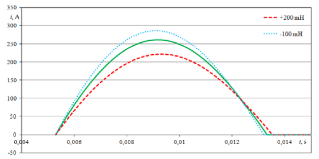 Changing the inductance of the power supply line (at a constant resistance value) has a lesser influence on the waveform of the inrush current than the change of its resistance. The greatest effect of the change in the inductance of the line occurs for the first impulse of the inrush current and decreases for subsequent pulses. The change of the network inductance by +200 mH, -100 mH causes, respectively, a change in the maximum value of the first current impulse by +25 A, -39 A and a change in its duration by +0.29 ms, -0.19 ms (Fig. 11). Increase in the maximum value of the first current impulse and decrease the second and subsequent ones while reducing the inductance is characteristic (Fig. 9). When increasing the inductance, the effect is reversed. The reduction of the inductance of the power supply line also entails a shortening of the duration of the inrush current impulses.