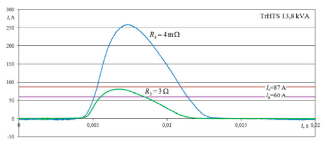 Power supply line resistance has a greater impact on the value and duration of the HTS transformer inrush current than in the case of a conventional transformer. During the rise of the inrush current impulse, when the HTS transformer windings are in the superconducting state (interval I, Fig. 1), the current is only damped by the resistance of the power supply line. The value of this resistance determines whether the current impulse exceeds the critical value for the HTS winding and how long it will last.