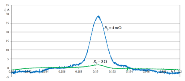 The pulse of the first impulse of the inrush current recorded in the measurements is shown in Figure 4. With a power supply line resistance of 15 mΩ, the current impulse exceeds by 170 A the critical value of the primary winding current of 87 A. After increasing the resistance of the power line to 3.1 Ω, the first current pulse reaches 81 A and does not exceed the critical current value for the winding. At this resistance value, the inrush current disappears completely for 10th pulse (Fig. 5), i.e. after 0.18 ms, while for resistance 15 mΩ, this is only done after 4 seconds.