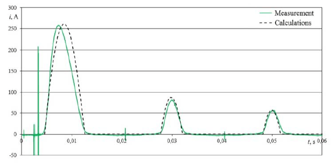 In the numerical analysis, good compliance with the measurement results has been obtained (Fig. 6). The relative error between the maximum value measured and the calculated value is 1.3% for the first impulse and 8.2% and 0.4% for the subsequent ones, respectively. The relative error of the duration of the first impulse is 7.6%, followed by 8.1% and 8.5% for the subsequent ones.