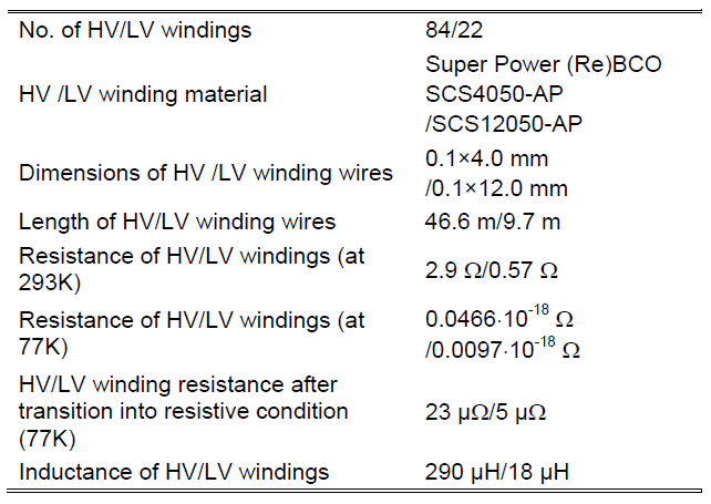 A single-phase HTS transformer with a power of 13.8 kVA has been tested (Fig. 2) [7]. The rated voltage of the primary (HV) and secondary (LV) windings is 230 V and 60 V, respectively. The rated current of the primary (HV) winding is 60 A, and that of the secondary (LV) winding is 230 A. The nominal parameters are to be found in Table I. The transformer’s primary winding was made with the SCS4050-AP superconducting tape, with a minimum critical current of 87 A at 77 K, in the own field. The secondary winding was made with SCS12050-AP tape with a minimum critical current of 333 A. Parameters of windings are given in Table II.