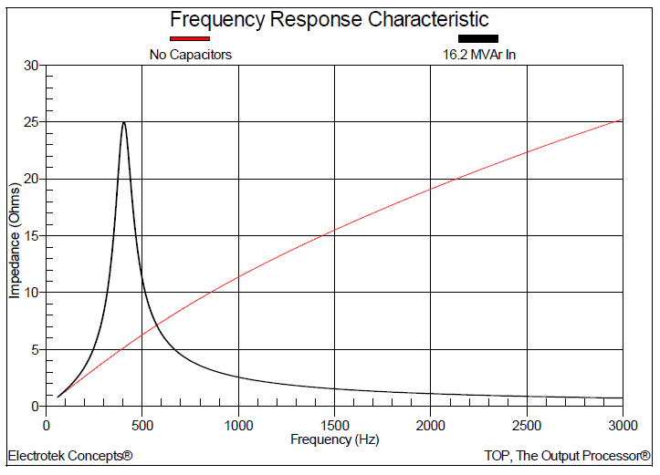 Figure 3 shows the impedance vs. frequency simulation result with the 16.2 MVAr, 24kV capacitor bank in service. The initial basecase result is also shown on the graph so the two conditions can be compared. The simulated parallel resonance due to the addition of the shunt capacitor bank was 404 Hz (6.73th harmonic). A simple hand-calculation can be used to validate this result: