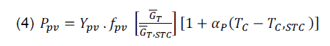 The output power of the photovoltaic system (ppv) in (kW) expressed in the following relation in equation (4). Where (fPV) is the derating factor percentage for the photovoltaic array, (YPV) is the photovoltaic array rated capacity in (kW), which is the power production under STC. (GT,STC) is the incident solar insolation at STC (1 kW/m2), (GT) is the solar insolation incident on the PV array at the current time step in (kW/m2), (Tc,STC) is the temperature of the photovoltaic cell under STC which is 25°C, (Tc) is the temperature of the photovoltaic cell at the current time step in (°C), and (αP) is the power temperature coefficient in (%/°C). [11][12][13].