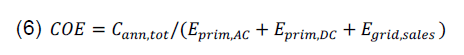 Where (Egrid,sales) is the overall sold energy from the grid in(kWh/year), (Eprim,DC) is the DC primary load served in (kWh/year), (Eprim,AC) is the AC primary load served in (kWh/year) and (Cann,tot) is the overall yearly cost in ($/year).