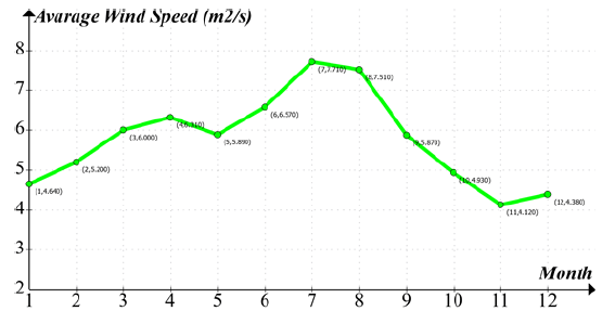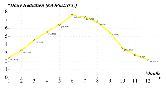 Both wind speed and solar Irradiance data have been obtained for Duhok, Iraq is determined by surface meteorology and solar energy project (SSE) of National Aeronautics and Space Administration (NASA) [6], which collects meteorology and insolation data for entire earth in order to help in the evolution of renewable and clean energy systems [7]. As showed in HOMER program software, the longitude and latitude of Duhok is 42°56’38.0″ E, 36°51’36.4″ N respectively. The mean daily irradiance per each month showed in Fig. 3 for an annual average 4.85 (kWh/m2/day), whereas Fig. 4 reports the mean daily wind speed per each month for annual average 5.67 (m/s). also the mean daily irradiance per each month showed in Fig. 5 .