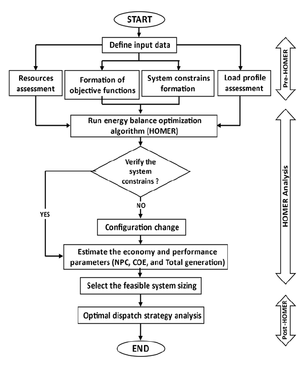 Hybrid optimization model for electric renewables (HOMER) is a computer model established by the National Renewable Energy Laboratory in the United States (NREL) to help designers to design renewable energy systems in both ON-grid and OFF-grid projects and ease the assessment of power generation technologies through an extensive variety of combinations. [15],[16]. A flowchart of HOMER simulation process can be found in Fig. 6 below which describing all the simulation stages in detail [17]: