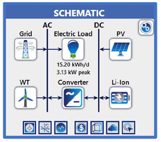 The hybrid power model designed in the HOMER program is shown in Fig. 7 & Fig. 8 respectively. This model consists of Generic 3 kW wind turbine, Generic PV flat plate, electronic converter, Generic Li-ion 1 kWh battery and residential load.