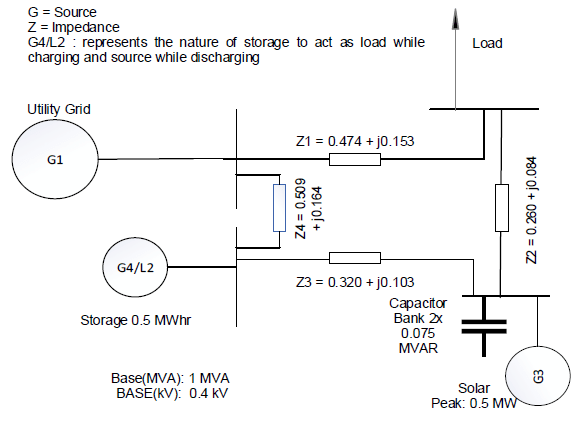 The single line diagram of the setup is as shown in Fig 2. The specifications of all components are also shown. Nominal voltage of the system is 400V.