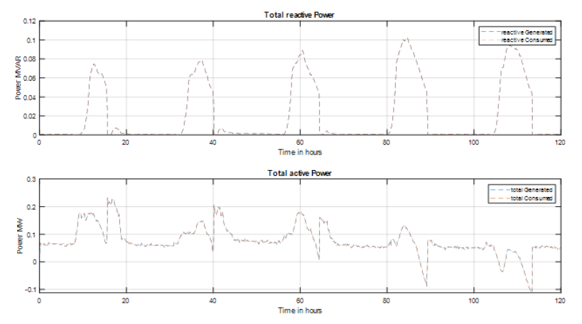 where PG, QG, PD, QD, PL, QL represent active power generated, reactive power generated, active power demand, reactive power demand, active power loss in the system and reactive power loss in the system, respectively. Figure 3 is a representation of the equations at (3) and it is evident that active and reactive powers consumed and generated match each other hence validating the accuracy of MATPOWER and the simulated system design.