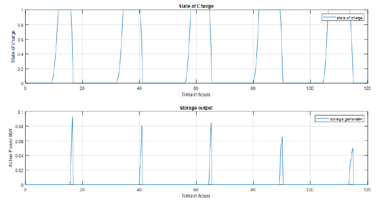 Figure 5 demonstrates how SOC (state of charge) of the storage device changes with its output and storage capacity. From the Fig. 5 it can be noticed that when the storage output generation increases the state of charge value decreases accordingly.