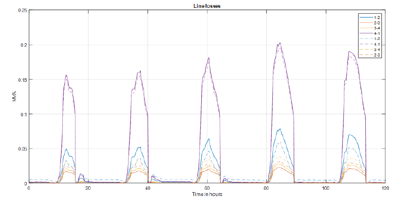 Figure 7 represents line losses for cases with and without reactive power compensation. It is evident from the figure that the line losses with reactive power compensation (dashed lines) are lower when compared to the line without compensation (solid lines) for lines ‘1-2’ and ‘1-4’ which are the lines used to export and import power from the utility grid, hence it can be concluded that with reactive power compensation overall reactive power demand is reduced.