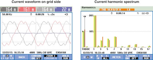 After the installation of the complete power conditioning solution, the TDK field application engineers and their partners typically perform a comprehensive power quality analysis with a specific focus on harmonics as proof of the installation’s effectiveness. According to the power quality data gathered on-site at a recent installation, the PQSine S series limits the system THD-I to below 3 percent. The system current was about 160 ARMS during the specific measurement. Overall, the PQSine solution successfully delivered the highest level of power quality. The current phases were sinusoidal with a very low level of THD-I (Figure 5), and the power factor was nearly 1.0.