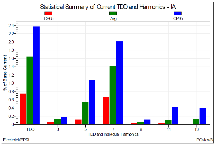 The statistical summary in Figure 10 corresponds to the harmonic current data previously shown in Figure 6 (current demand distortion trend). Statistical analysis yielded a CP05 value of 0.74%, an average current of 1.64%, and a CP95 value of 2.37%. Analysis of the measurement results showed that the harmonic currents did not exceed the IEEE Std. 519 TDD limits during the twenty-four day measurement period.