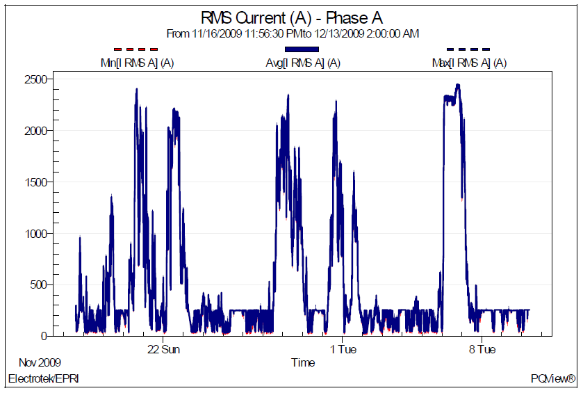 Figure 3 shows the measured total plant rms (Phase A) current trend. The corresponding phase current histogram is shown in Figure 4. The average value was 543 A, the maximum value was 2,449 A, and the CP95 value was 2,177 A (130 MVA). The CP95 value was used for the facility load current rating in the IEEE Std. 519 harmonic analysis.
