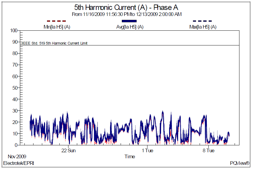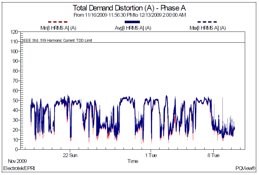The twenty-four day monitoring period was from November 16, 2009 through December 13, 2009. The power quality instrument used to complete the harmonic measurements was the Dranetz Power Xplorer PX5. The instrument samples voltages and currents at 256 points-per-cycle and follows the IEC 61000- 4-7 method for characterizing harmonic measurement data. This involves analysis of continuous 200msec samples and storing aggregated 10-minute minimum, average, and maximum trend data. The measurement and statistical harmonic analysis was completed using the PQView® program.