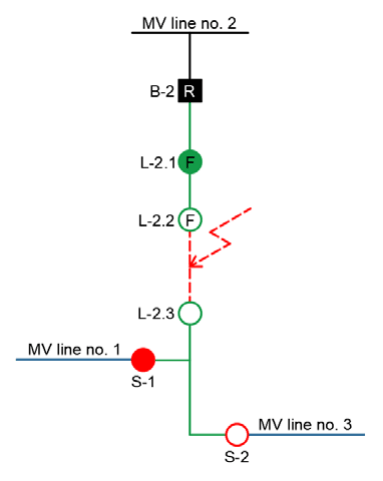 Due to a fault location between the L-2.2 and L-2.3 switches, the opening of the L-2.3 load switch does not isolate the fault and line switching on causes a repeated short-circuit current flow. The fault indicators and the substation protection relay are activated again. Again, after the set time, the line is switched off by the B-2 circuit breaker. Despite the fault is not isolate, the test line switching on clearly defined the fault location between the L-2.2 and L-2.3 switches. Thanks to this, FDIR can properly isolate the fault by opening the L-2.2 load switch. The damaged line section is isolated from both sides (Fig. 5).
