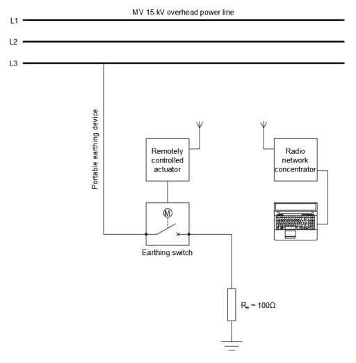 Conducting a comprehensive check of switching points made possible to properly prepare the grid to carry out the real functional tests, checking the automation operation with the assumed scenarios. During testing, the MV grid covered by the automation operated in the normal conditions. In order to simulate the fault conditions, triggering automation operation, controlled single-phase earth faults were made at selected grid points using a grounding switch. As a grounding switch it was used a small oil volume circuit breaker, enabling switching on and off short-circuit currents. The connection of the earthing switch to an overhead MV line was made by a portable earthing device, which was mounted directly from the ground. The grounding of the second circuit breaker terminal was made by connected copper grounding rods. The target value of earthing resistance during short-circuit tests has been set at 100 Ω. In order to ensure the safety of the earthing switch staff, the switch has been equipped with a remote control actuator. For this purpose, a dedicated, PC-connected radio communication data concentrator was used. The scheme of the earthing switch stand is shown in Figure 7.