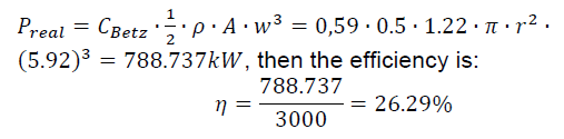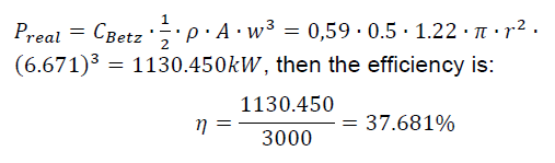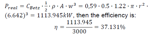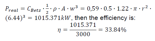 -the average wind speed per year is 6.44 m/s, Based on the installed capacity the efficiency is calculated as below: