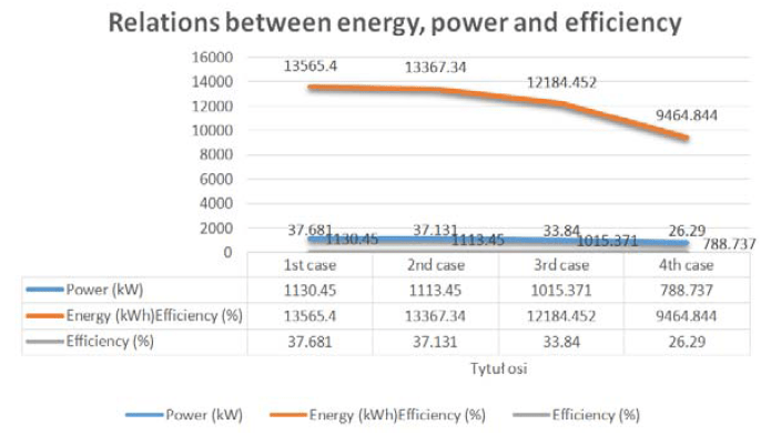 In a 3rd case which is thought to be the average height, the power generated is 1015.371 kW, with an optimum efficiency from 33.84%, and the last case studied presents the case with the lowest power and efficiency achieved.