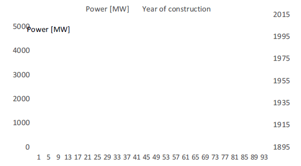 The age of the power plants operating in Poland starts at the end of the XIX century (1896) until 2015. The main fuel used in power plants from the years 1950-1980 of the last century is coal. It is worth emphasizing that Chojnacka and Chojnacki (2018) [24] predict that the percentage of hard and brown coal used in the electricity production will continue to grow. However, newer power plants increasingly base their production on alternative, including renewable energy sources.