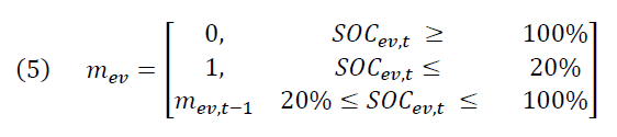 where mev is the device status, mev= 0 means that the appliance is switched off, mev=1 means the appliance is switched on, and SOCev,t is the battery SOC in the time interval.