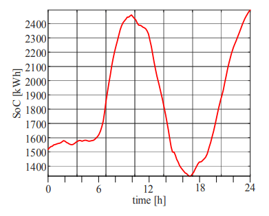 Figure 5 shows the change in state of charge of the BES during the daily work of the microgrid. It can be seen that the storage does not work in the whole range of its capacity. This can be an advantage because the BES is not deeply discharged, which significantly increases the battery life period. Performed simulations also allow to verify the required capacity of the BES. The example shown in Fig. 6 assumes a variable power level PZ throughout the day. The BES power control scenario tries to match the exchange power level with the distribution network to the set curve defined within the PZ 0.2 – 0.5 MW. The proposed approach is aimed at attempting to use a control algorithm that considers both, economic and technical conditions. The PZ curve is a required daily plan for changing the power of PS exchange between systems and may correspond to, e.g. forecasted changes in energy prices on the market. The parameters of the BES, power generation and load are identical to the previous example.