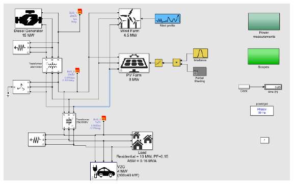 The microgrid is divided into four important parts: A diesel generator, acting as the base power generator; A PV farm combined with a wind farm, to produce renewable energy; a vehicle to grid system installed next to the last part of the topology which is the load of the grid. The size of the microgrid represents approximately a community of a thousand households during a low consumption day in spring or fall. There are 100 electric vehicles in the base model which means that there is a 1:10 ratio between the cars and the households. This is a possible scenario in a foreseeable future.