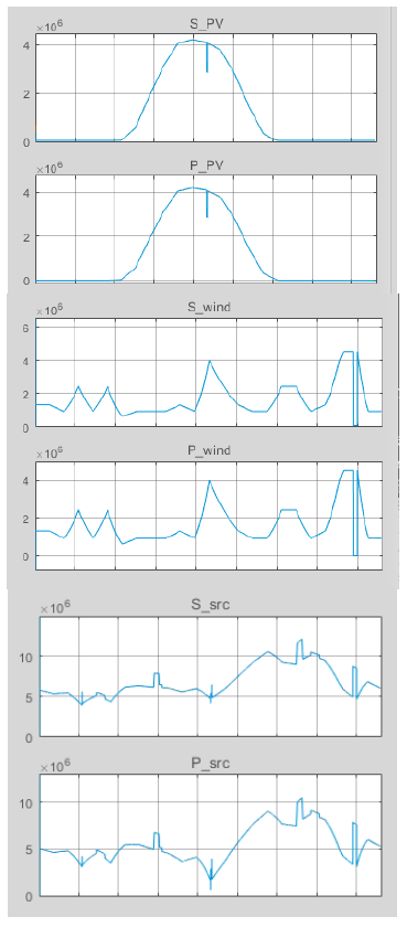 2. The simplified model of a wind farm produces electricity after a linear relationship with the wind. When the wind reaches the nominal value, the wind farm produces nominal power. The wind power plant emerges from the grid when the wind speed exceeds the maximum wind speed until the wind returns to its nominal value.
