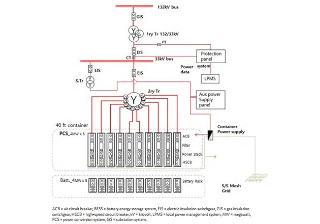 • The battery system is connected to the inverters, in order to convert the power in AC. In each BESS there is a specific power electronic level, called PCS (power conversion system) usually grouped in a conversion unit, including all the auxiliary services needed for the proper monitoring.