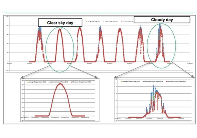 • This would compensate for the “volatility” of the generation profile when clouds occur or when there are sudden peaks of power increase, in order to obtain a more predictable and stable generation curve. Figure 4 shows the difference of the generation curve of a PV plant on a cloud day versus a clear sky day. The integration of a BESS would reduce the “flickering” of the generation, resulting in a more regular curve.