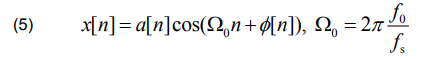 where Ω0 is normalized frequency (pulsation) in radians of the discrete-time signal, and n=-N,…,0,…,N is the sample index.