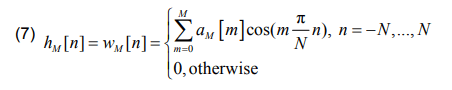 Flat-top (FT) windows have an unique feature of simultaneous perfectly flat or equiripple spectral main lobe and fast decaying of the sidelobes. FT windows are cosine windows defined as [3]