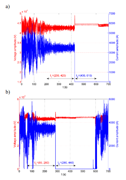 Before computing phasors, signals were downsampled to the sampling frequency 800 Hz, and the phasors were computed, in respect to 50 Hz nominal frequency, as recommended in [1] with the flat-top window M=5, D0=2, DN=2, L=207 [2]. Fig. 3 shows the envelope of three phase voltages and currents obtained from phasors. In both cases, Fig. 3a,b, significant drop of current and slight increase of voltage is observed after switch off. In Fig. 3 time intervals t1 and t2, before and after electric arc furnace switching, are marked. Fig 4 shows instantaneous frequency computed by phasor and also the instantaneous frequency averaged with Finite Impulse Response (FIR) filter having flat impulse response. The arithmetic average was computed from 301 values. In Figs. 4 it is seen that the frequency change is different for case “a)” and “b)” although in both cases the electric arc furnace is switched off. In case “b)” the frequency unexpectedly decreases.