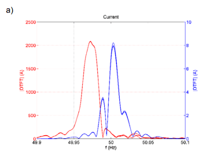 Especially, abnormal frequency behavior in Fig. 7b is easy to be observed. Figs. 7ab show the DTFT of three phase voltage and current computed in time intervals t1 and t2 (see Fig. 3). The frequency of signals in intervals t1 and t2 was estimated by the three points IpDFT with the Hann window presented in [9], i.e. for α=2. The mean frequency in all measurement points for time intervals t1 and t2 is 49.973 Hz and 50.004 Hz for the case “a” and 50.023 Hz and 49.992 Hz for the case “b)”.