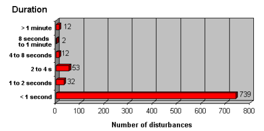 The most demanding processes in the modern digital economy need electrical energy with 99.9999999% availability (9-nines reliability) to function properly. Between 1992 and 1997, EPRI carried out a study in the US to characterize the average duration of disturbances. The result for a typical site, during the 6-year period is presented below.