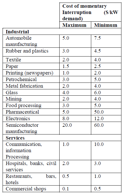 Table II – Typical costs of momentary interruptions (1 minute, in $/kW demand, for different types of industrial and services facilities).