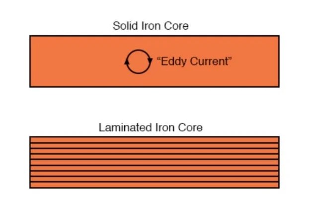Constructing the core from thin sheets of iron laminated together can minimize this loss. The thin sheet-iron layers shorten the current path and minimize the eddy currents (see Figure 1). Each sheet is coated with an insulating varnish that forces these currents to only flow within individual laminations. This reduces the overall eddy currents in the entire core. These thin sheets are manufactured from silicon-iron or nickel-iron alloys that can be magnetized more readily than pure iron. The use of alloy cores also improves the age resistance of the core. The sheets are often made from 29-gauge alloy, which is only 0.014′′ thick.