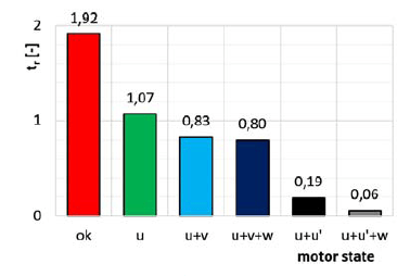 Firstly, influence of the phase failures on the motor breakdown torque was examined. Load torque was being increased with speed 10 Nm per 1 s. The results are given in Fig. 14. Next, influence of the phase failures on the motor starting torque was investigated. Supply voltage during measurement was equal to 80 V, starting torque value was referred to rated voltage Un=200 V. The results are presented in Fig. 15.