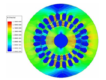 Stator double layer winding consists of 24 coils made of round double enamelled copper wire with coil pitch ys=5/6. Rotor winding consists of quasi-trapezoidal copper bars. Each rotor bar includes 2 rectangular copper bars with wider one at the bar top. Rotor slot openings are quite wide to decrease rotor winding leakage reactance and to obtain high starting and maximum motor torques. FEM motor model is presented in Fig. 1. Magnetic field distribution for rated load power is shown in Fig. 2.