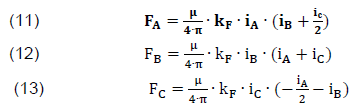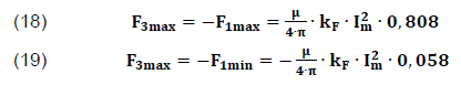 The value of electrodynamic forces acting on the center busbar of the system presents slightly different. After substituting the current formulas, the equation is obtained: