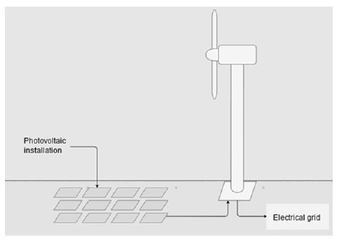 The main advantages of optimising the structure of a wind farm include: an increase in the share of renewable energy sources in energy production, stable operation of the power grid and improved efficiency of wind turbines. The main advantages of connecting a wind turbine with a photovoltaic installation are the operation of the power grid based only on the supply of energy from the turbines and the reduction of active power drops and voltages in the power grid. Advantages of PV installations as a source of maintenance of wind farm turbine units [23]: easy and cheap construction cost, installation of photovoltaic modules, inverter, AC and DC side protection, cabling, surge arresters, grounding and assembly with delivery of modules. (The cost will be PLN 40-50 thousand for the selected turbine).