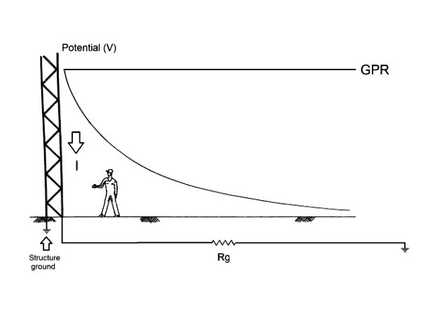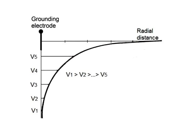 When a current (I) from a ground fault or an atmospheric discharge goes through the grounding electrode, it flows through all resistors to infinity. According to Ohm’s law, this current creates a voltage drop of magnitude V = IR across each resistance.