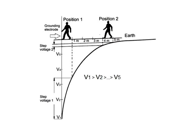 Situation 1 is the step voltage. When people walk towards the grounding electrode, their feet “see” different potentials. The potential difference is the step voltage. The standard length of a step is 1 m for people and 1.5 m for animals.