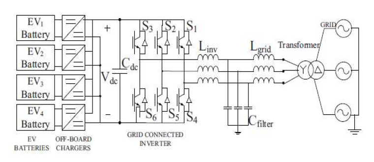 DC fast charging station configuration includes EV batteries, on-board charger, grid-connected inverter, dc bus, LCL filter and step up transformer. It implements V2G-G2V framework in microgrid. There are two important components of this charging station are