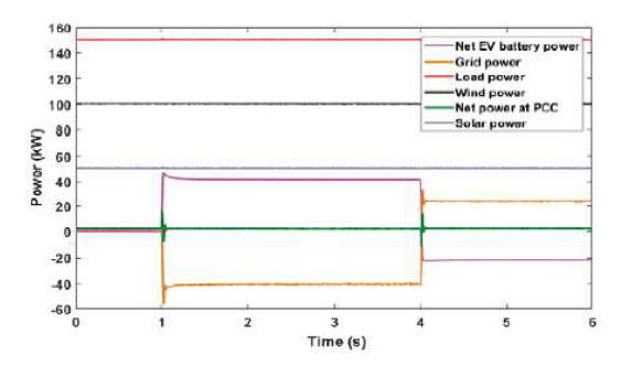 Active power profile of various components in the system is shown in fig 5. The power from grid changes to adapt power transfer by electric vehicles. “ the negative polarity of grid from 1s to 4 shows power transferred from vehicle to grid”. The change in polarity at 4s shows power is transferred by grid to charge the vehicle. This shows the V2G-G2V operation. Net power PCC is zero, this shows that power is balanced in the system.