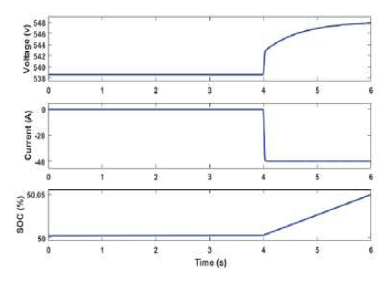The designing and modulation of DC fast charging system for electric vehicle in microgrid is successfully and the results shows that it works precisely. Wind turbine is work preferably at rated speed giving maximum power up to 100KW. Solar photovoltaic system is checked under standard conditions it can provides maximum output power of 50KW. To work at unity power factor, the 480V AC bus is connected to 150KW resistance load. According to reference of CGI reactive current is set to zero. It is proven that “ the initial state of charge of electric vehicle is set to 50% and once the steady conditions are obtained V2G and G2V power transfer is carried out using batteries of EV1 and EV2”. Table 1 shows current set points for battery charging circuits of EV1 and EV2. Fig 3 and 4 shows battery parameters when EV! Is operating in V2G and EV2 is operating in G2V modes.