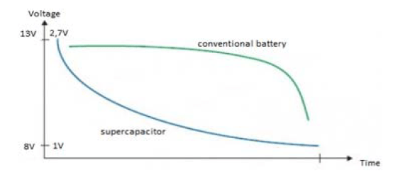Comparing the characteristics of batteries and supercapacitors, we can see a big difference between them, which unfortunately may have a negative impact on the possibility of using the second ones with typical inverters, because we will only use a small part of the stored energy.