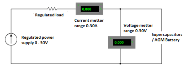 To determine the characteristics of the supercapacitor and AGM battery, the measuring system, which scheme is shown in Figure 2 was constructed.