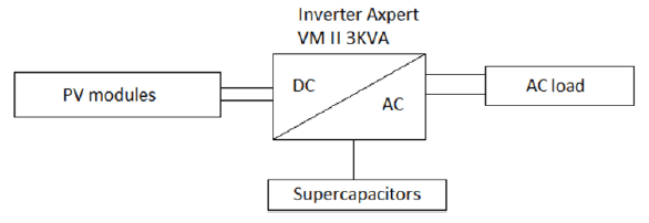 The research carried out for the purposes of this article was divided into two stages. The first stage was aimed at determining the operation parameters of the supercapacitors and batteries and was performed using DC voltages. In the second stage the complete PV system equipped with mixed energy storage bank was constructed and investigated by DC and AC analysis.