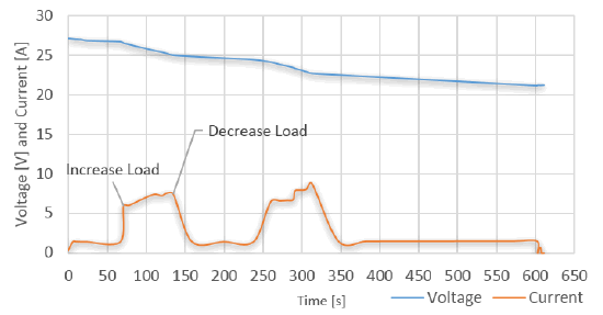 The first load measurements were made in the evening hours, when there was no generation from the connected PV installation. During these measurements, various loads were connected to the AC output of the inverter. Additionally in the inverter setup the battery cut-off value was set to 21 V. The example shape of the voltage at the supercapacitor terminals and the outgoing current are presented in the Figure 8.